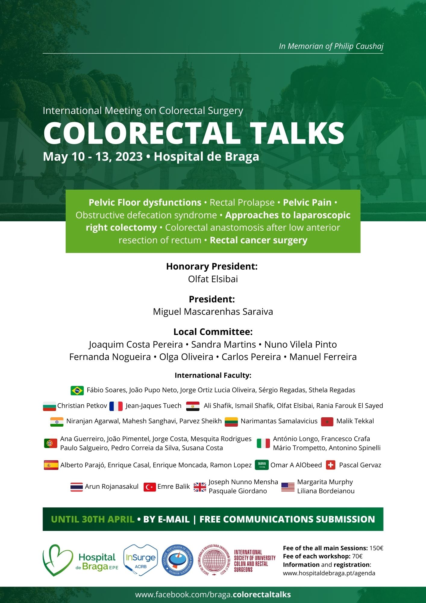 Estamos entusiasmados por anunciar a primeira edição do Colorrectal Talks - Encontro Internacional sobre Cirurgia Colorectal. O Encontro terá lugar no Hospital de Braga, entre os dias 10 e 13 de maio de 2023.